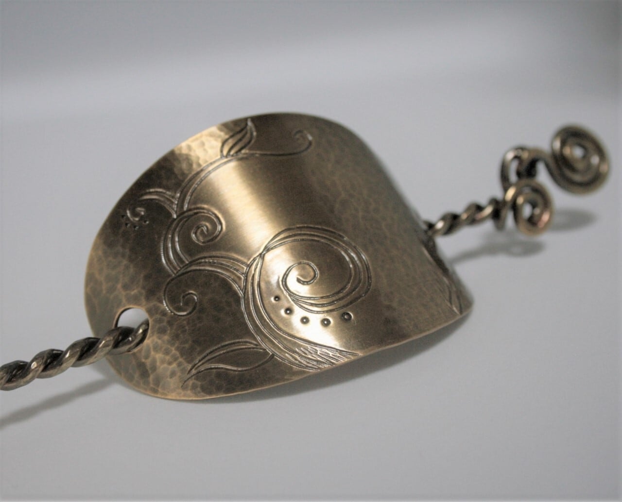 唐草模様を一つ一つ手彫りした、彫金らしさが出る髪留めです。